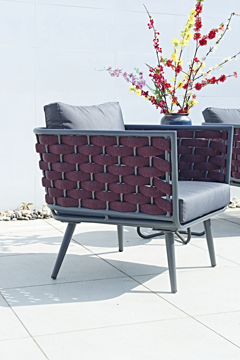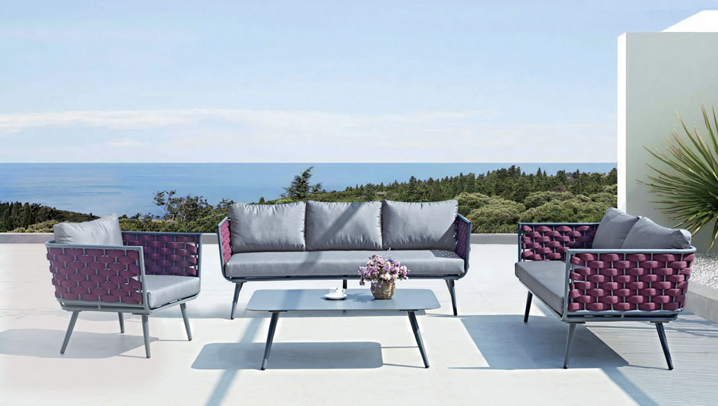 Die Sitzgruppe Porto Viola bringt modernes Design und funktionale Eleganz auf Ihre Terrasse. Mit ihrer klaren Formensprache, den hellgrauen Sitzpolstern und den violett geflochtenen Seiten setzt sie stilvolle Akzente im Außenbereich.